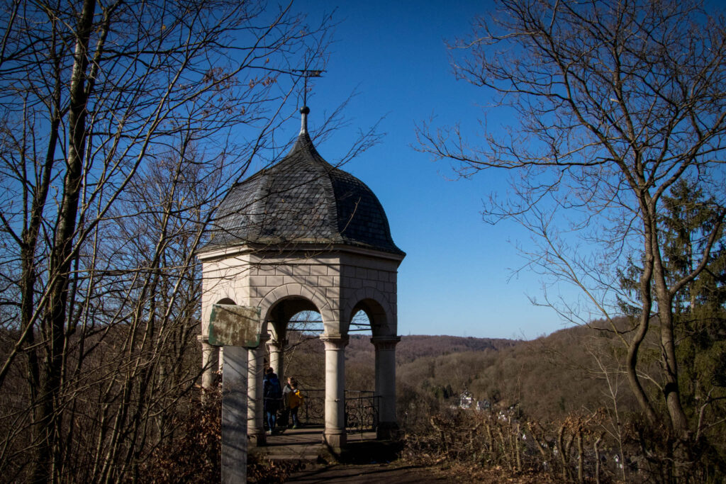 Vom Weißen Stein aus führt ein schmaler Pfad in mehreren Serpentinen hoch zum Diederichstempel Burg. Von hier aus bietet sich ein letzter Panoramablick auf Schloss Burg, bevor es im weiten Bogen um den Burgsiefen zum letzten Anstieg hinauf nach Schloss Burg geht.